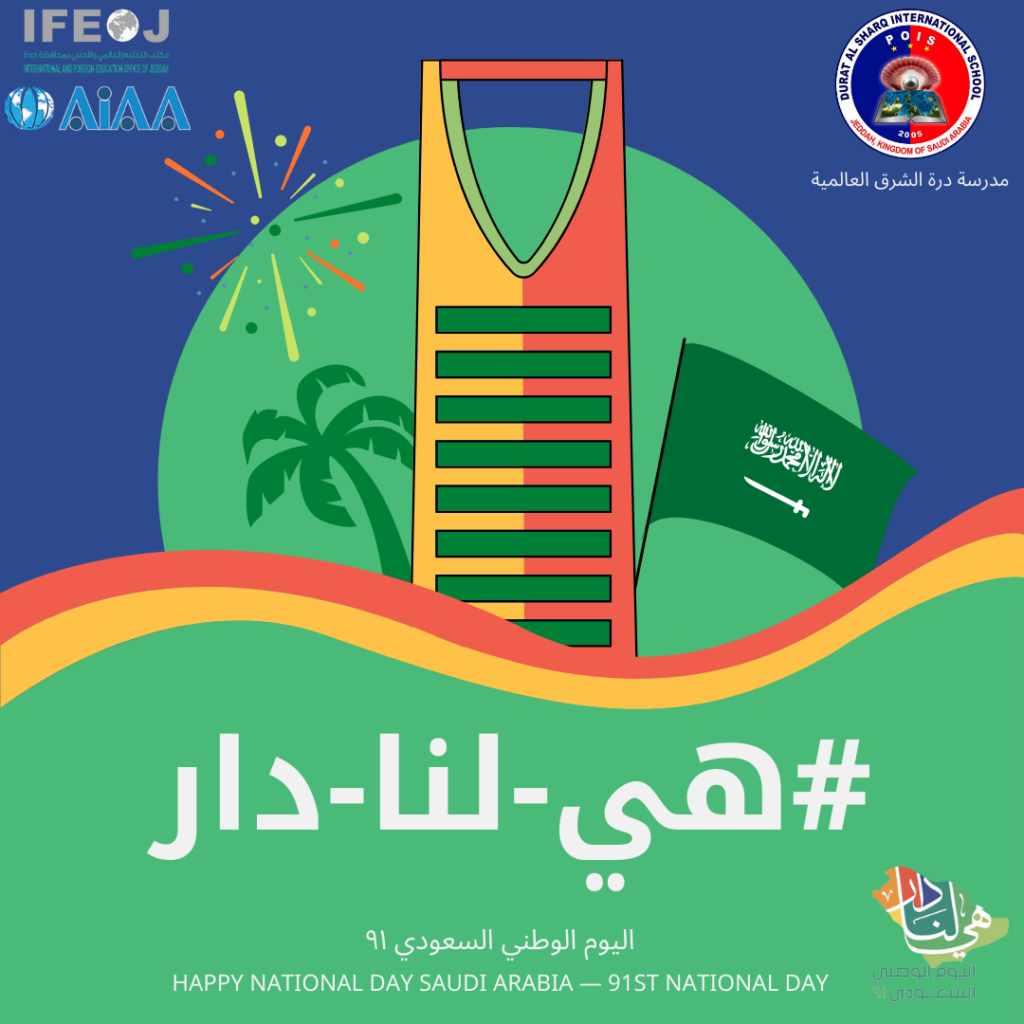 في ذكرى اليوم الوطني (٩١) للمملكة العربية السعودية يرفع منسوبو المدرسة التهاني الى سيدي خادم الحرمين الشريفين الملك سلمان وولي عهده الأمين الأمير محمد بن سلمان والى الشعب السعودي الكريم سائلين المولى العلي القدير أن يديم علينا نعمة الأمن والأمان وأن يحفظ بلادنا قادةً وشعباً.